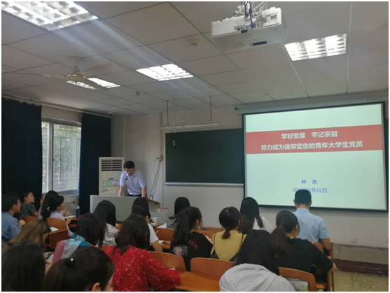 开班典礼上,由best365网页版登录党委副书记林凯对大家做了开班动员,动员结束后本次党校培训的理论学习正式开始。本次理论学习的第一讲由林书记主讲,他以“学好党章,牢记宗旨,努力成为信仰坚定的青年大学生共产党员”为主题,围绕中国共产党的党章、宗旨以及我们青年大学生所面临的挑战三个角度进行了深入浅出的讲解。他说道,青年大学生党员应当自觉学习、遵守、维护、贯彻党章,明确并在实践中贯彻中国共产党“全心全意为人民服务”的宗旨,在面对挑战时要敢于直面、勇于担当、坚定信仰。我们青年大学生党员是实现中华民族伟大复兴中国梦的青春力量,应当做到坚持一个导向,做好两个统一,培养三种能力,即牢牢坚持为人民服务的导向,做好“仰望星空”与“脚踏实地”的统一,培养明辨是非、求真务实、创新进取的能力。
